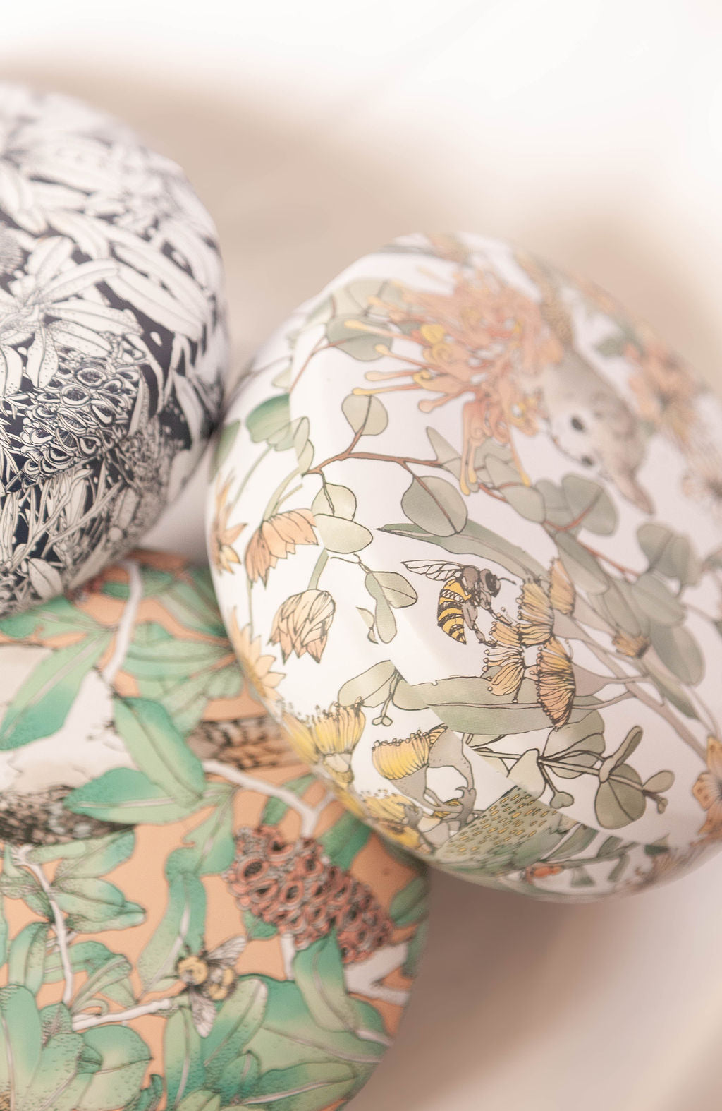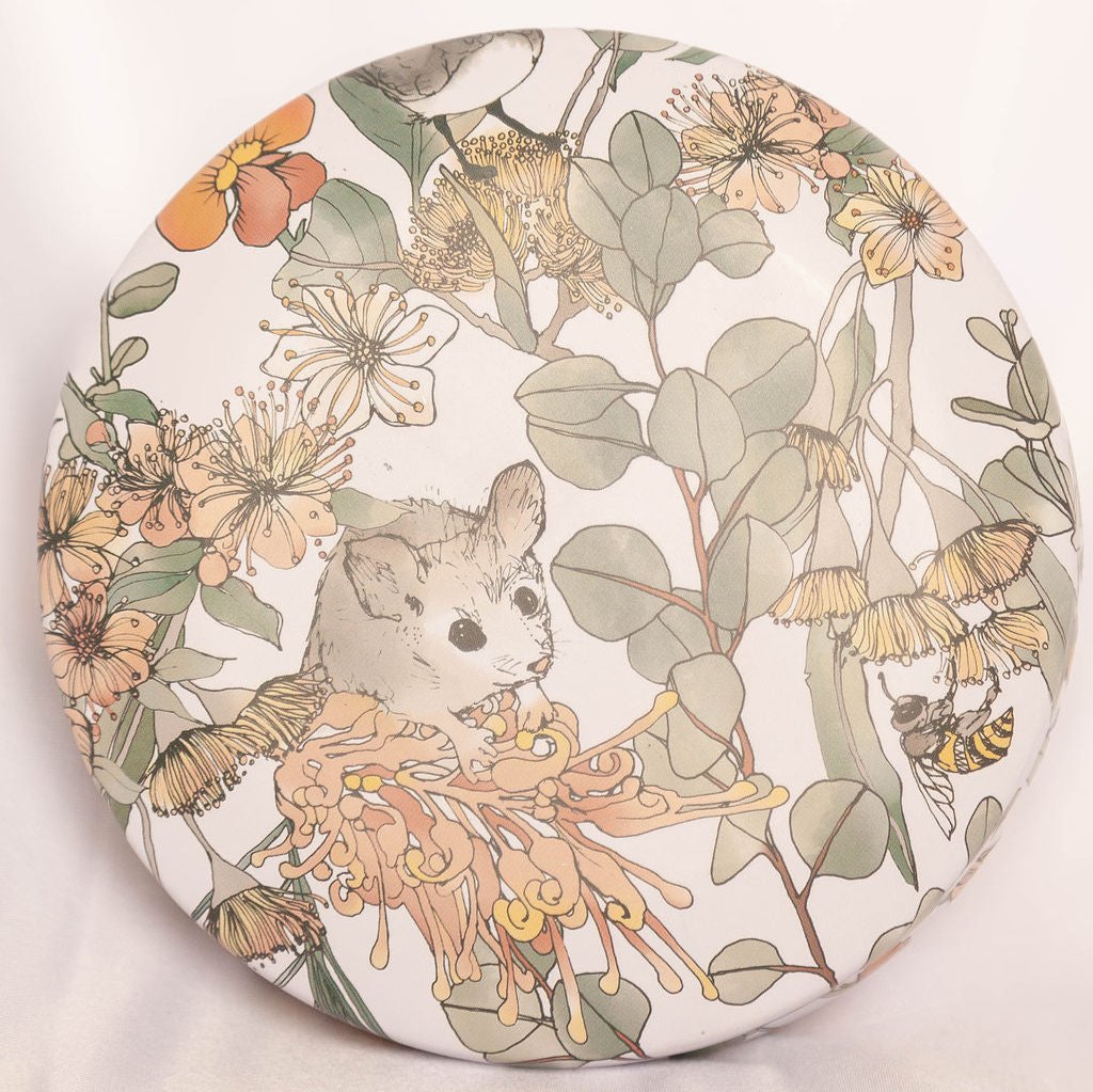 Depicting Hand drawn artwork by Australian artist Victoria McGrane, featuring the gorgeous Pygmy possum , gum blossoms and native bees ; this original tin contains 100% pure soy wax and aromatic Bush florals and native honey fragrance.